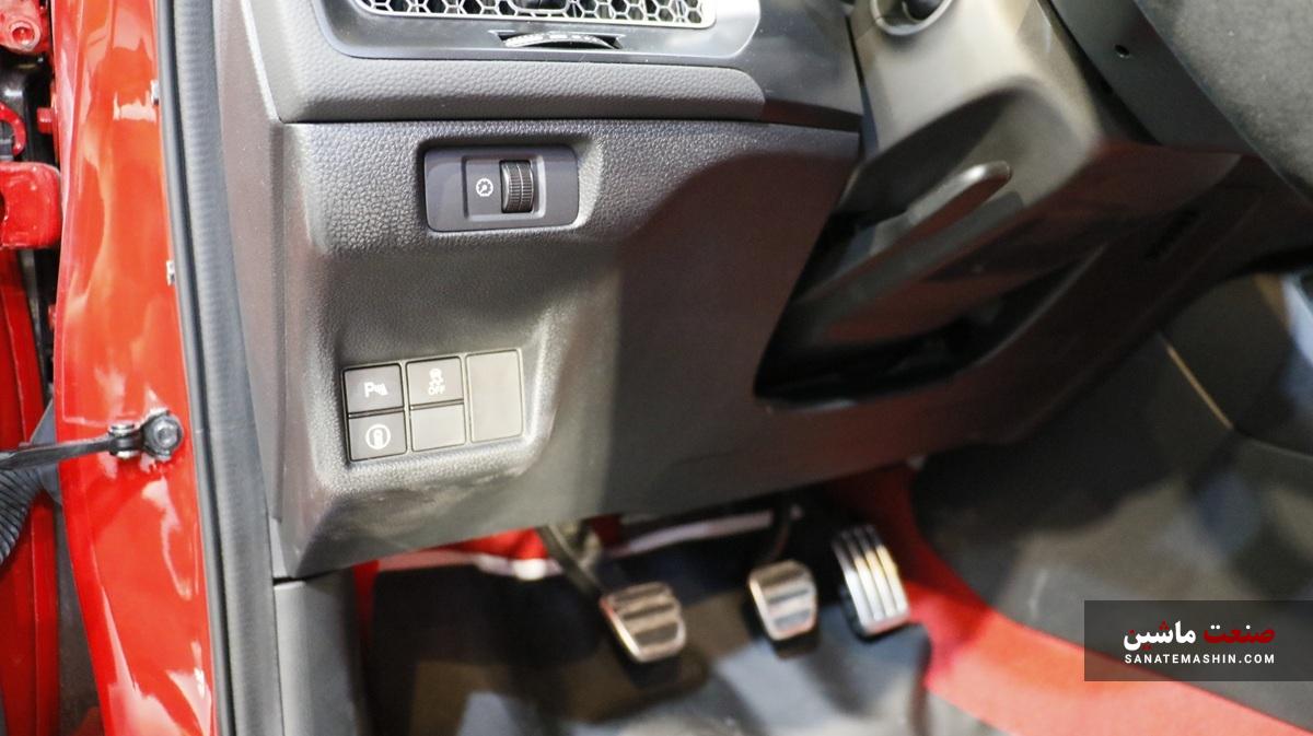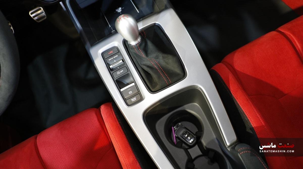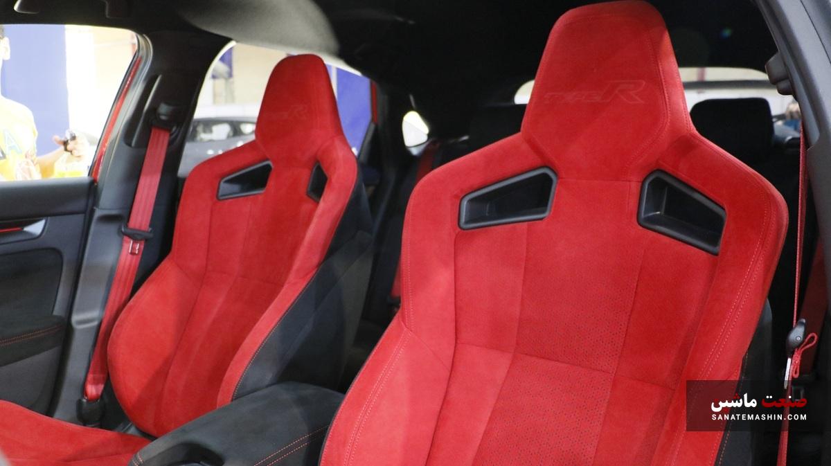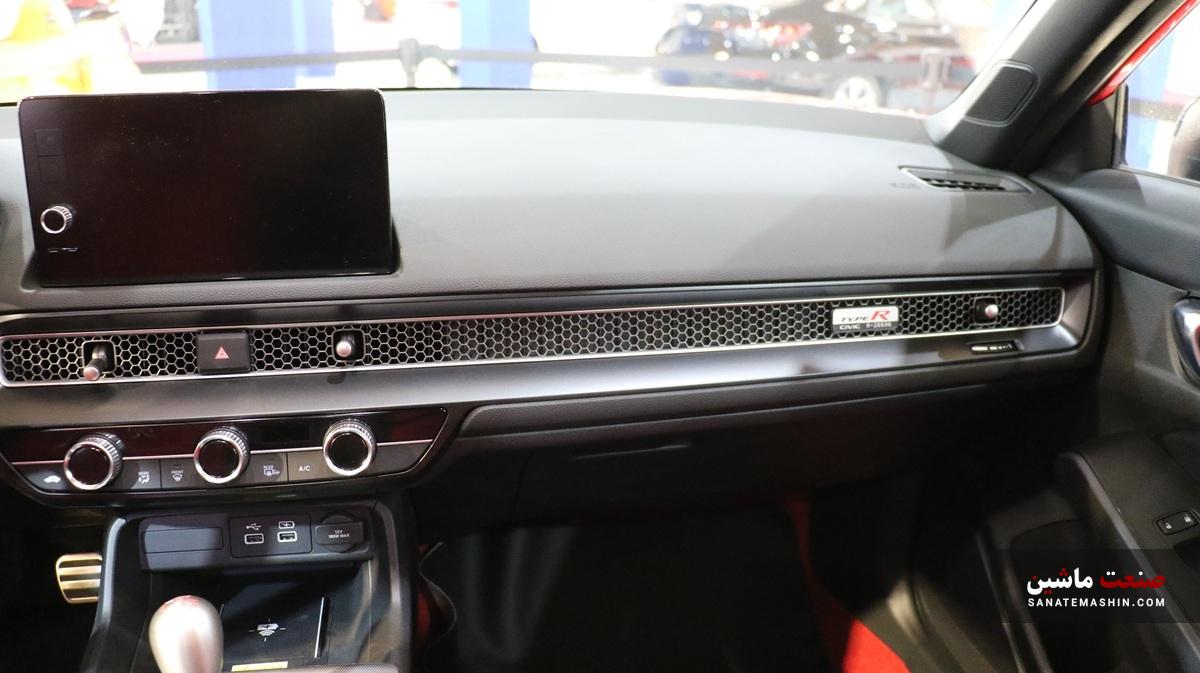 زبان جدید طراحی هوندا در فضای داخلی محصولات جدیدش واقعا بینظیر و تحسینبرانگیز است. زیرا در اوج مدرن بودن؛ المانهای کلاسیک وجود دارد که سبب ایجاد یک فضای فوق جذاب برای سرنشینان میشود؛ بنابراین طراحی کلیت داشبورد ساده و مینیمال بوده که با قرارگیری یک کلاستر ۱۰.۲ اینچی افقی در مقابل راننده و یک نمایشگر ۹ اینچی لمسی افقی در بالاترین بخش میانی داشبورد منجربه حس و حال مدرن بودن شده است. خوشبختانه خبری از داشبورد خلوت نبوده و سه دکمه چرخشی به همراه دکمههای فیزیکی که به منظور تنظیمات سیستم تهویه مطبوع در نظر گرفته شده؛ همان حس و حال داشبوردهای شلوغ اسپرت سیویک را به خوبی تداعی میکند. همچنین طراحی دریچههای سراسری لانه زنبوری مانند این خودرو که با مکانیزم فوق منحصربهفرد و جدید هوندا همراه است با بج (نشان) تایپ R روی دریچه سیستم تهویه مطبوع و کلیت طراحی داشبورد فضای جذاب و کلاسیک را جلوه میدهد. هرچند که طراحی غربیلک فرمان سه شاخه خوش دست هوندا به همراه دسته دندهای که مشابه دستهای شمشیرهای سامورایی و صندلیهای اسپرت به سبک جدید هوندا؛ هیجان را در زمان رانندگی با سیویک تایپ R به خود اوج میرسانند تا تجربه خاص رانندگی با یک سوپرلیفتبک را داشته باشید. نقدی که به طراحی داخلی هوندا سیویک تایپ R نسل ششم وارد است؛ این است که دیگر متاسفانه خبری از اهرم مکانیکی ترمز دستی نبوده و یک دکمه با مکانیزم الکترونیکی برای ترمز پارک در نظر گرفته شده است. روکش قرمز رنگ صندلیها و ترکیب آن با رنگ مشکی کابین این سوپرلیفتبک جسور ژاپنی را بسیار اسپرت جلوه میدهد. به دلیل انتخاب هوشمندانه شرکت آذریوردسال میتوان گفت که سیویک تایپ R یکی از بهترین گزینههای اسپرت برای جوانان و علاقمندان به هیجان است.