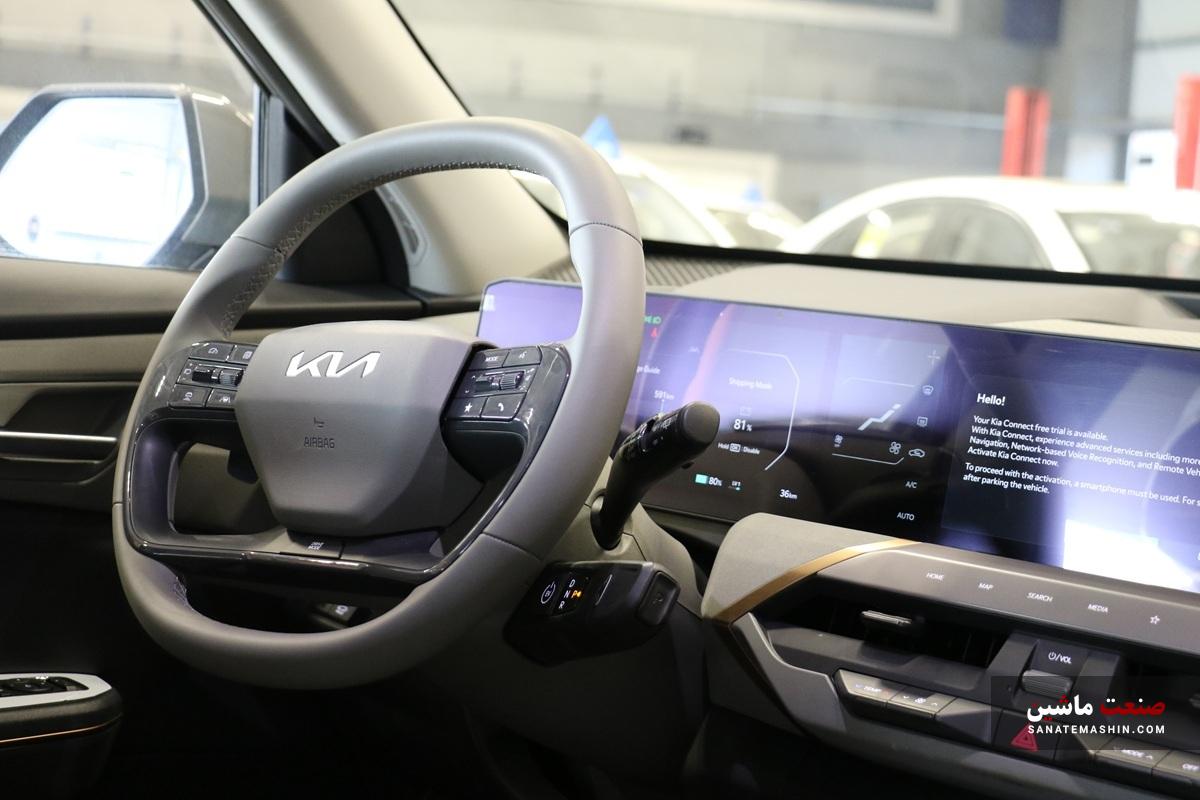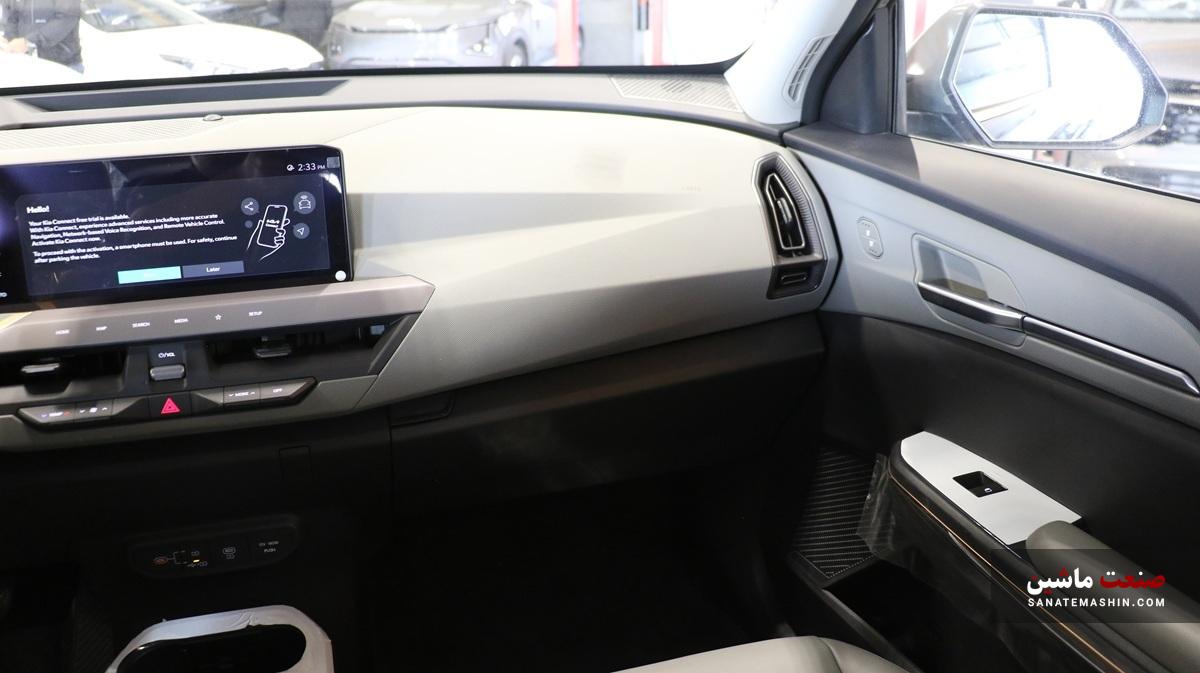 با ورود به کابین کیا EV5 شاهد کلیت طراحی داشبورد نسبتا ساده و مینیمال هستیم. هرچند که با قرارگیری دو نمایشگر 12.3 اینچی یکی برای کلاستر و دیگری برای مولتی مدیا فضای داخلی را کاملا مدرن جلوه میدهد. ناگفته نماند که طراحی ستونهای A با زاویه بیشتر، نورپردازی LED داخلی و سقف پانوراما منجربه شده تا به فضای داخلی جلوه زیباتری بخشد. علاوه بر این موارد طراحی دریچههای کولر عمودی در طرفین داشبورد و طراحی دریچههای افقی بخش میانی حس جذابیت بیشتری به کابین EV5 میبخشد. استفاده از متریال باکیفیت و دقت بالای مونتاژ سبب شده تا فضای داخلی بسیار لوکس جلوه داده شود. همچنین به لطف فاصله محوری 2750 میلیمتری، طول 4615 میلیمتری، عرض 1875 میلیمتری و قامت 1715 میلیمتر فضای کاملا راحتی را در اختیار سرنشینان میگذارد. در واقع کابین بسیار جذابی از یک خودرو شاسی بلند کراساوور میان سایز را به سرنشینان خود هدیه میدهد.