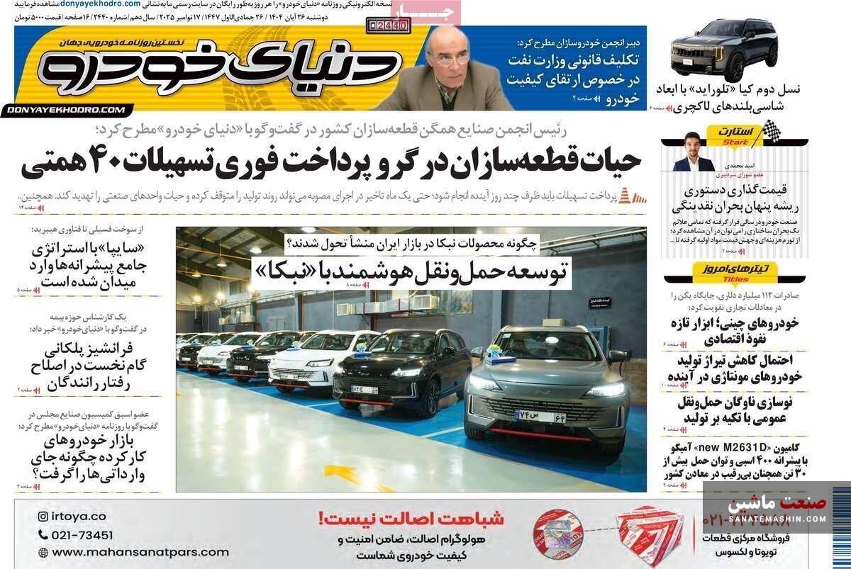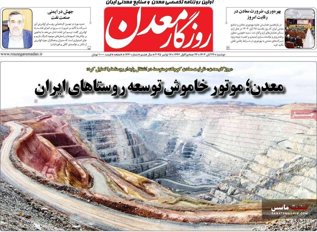 صنعت ماشین: صفحه نخست روزنامه های اقتصادی 26 آبان 1404 در صنعت ماشین منتشر شد.