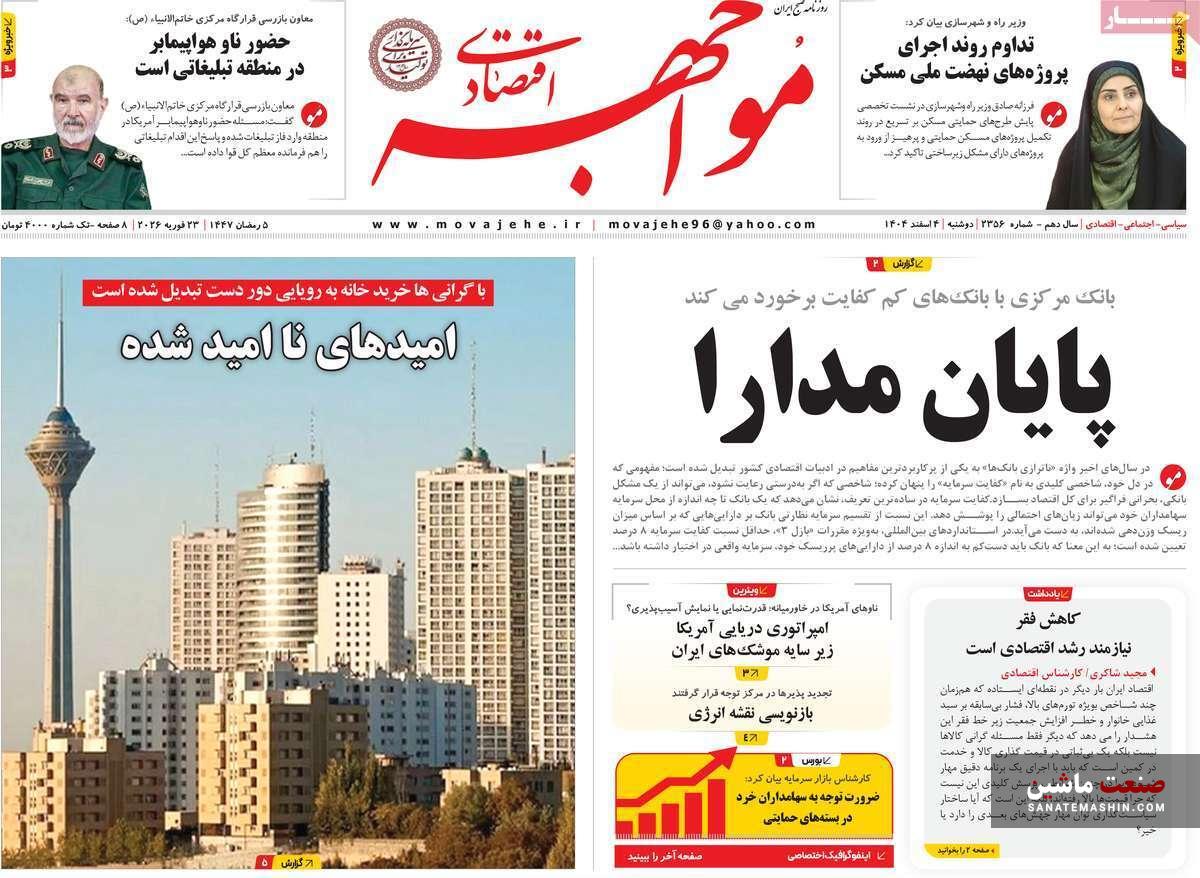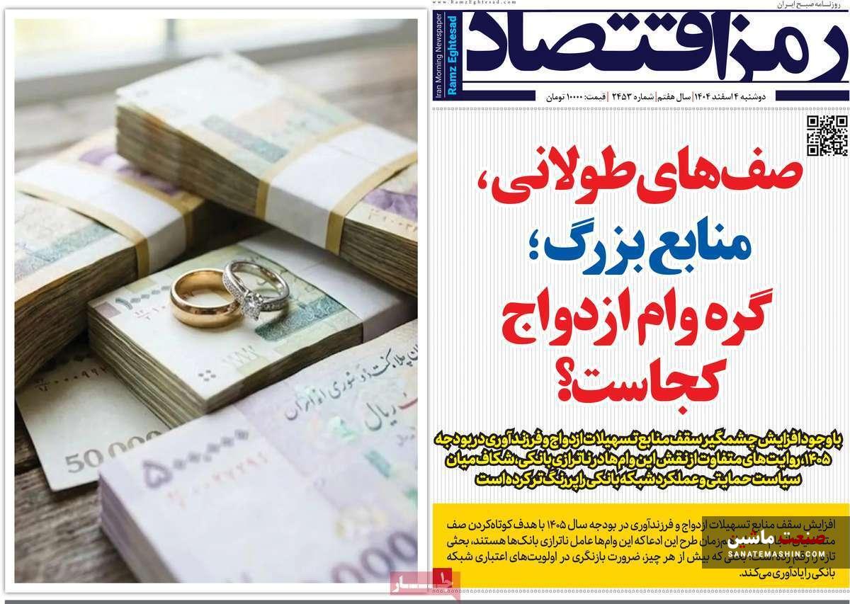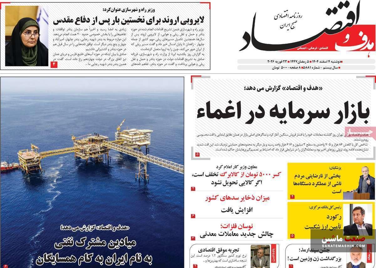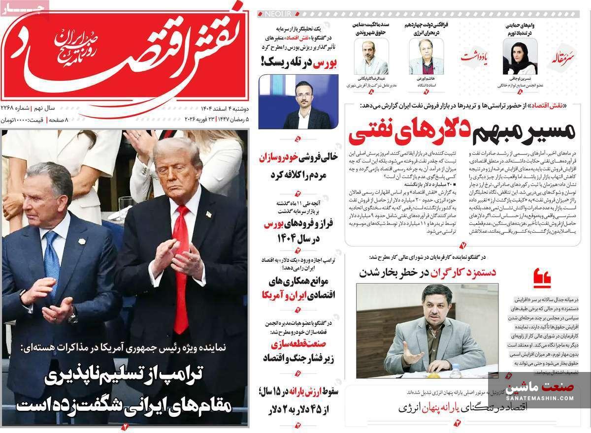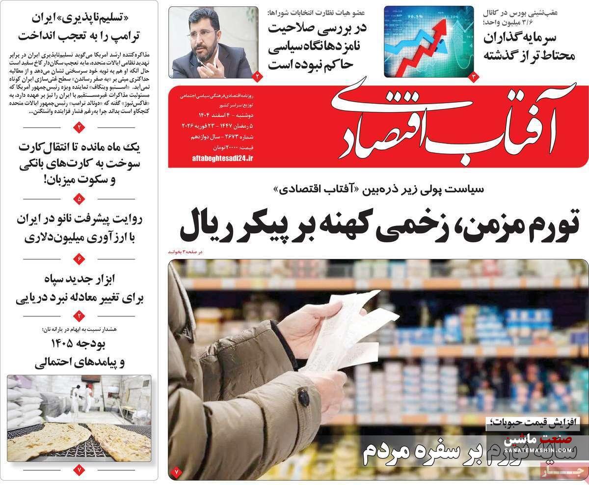به گزارش صنعت ماشین ؛ صفحه نخست روزنامه های اقتصادی 4 اسفند 1404 به شرح زیر است: